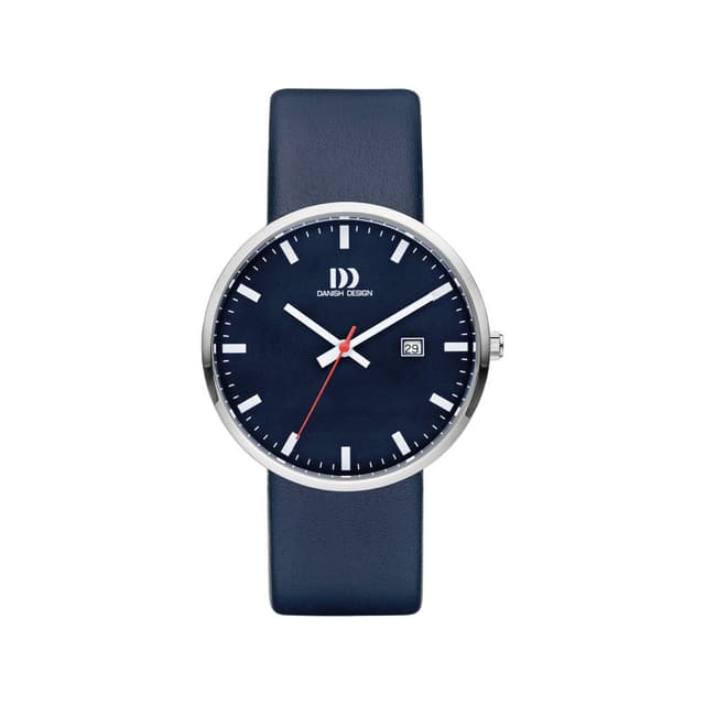 Dette danish design ur har en kasse i rustfrit stål med blå skive og hvide tidsmarkører, datodisplay, mineral krystal glas og en blå læderrem.
