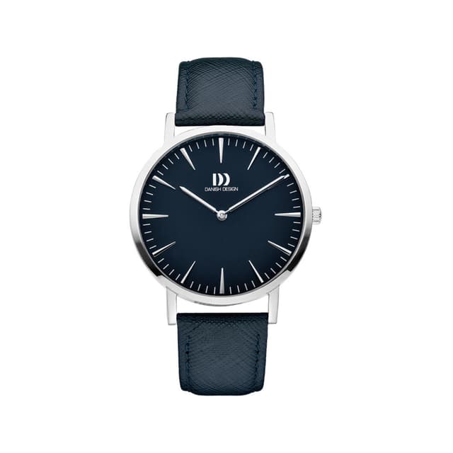 Dette simple og stilfulde ur fra danish design har en kasse i rustfrit stål med blå skive med sølvfarvede visere og tidsmarkører, mineral krystal glas og en blå læderrem.
