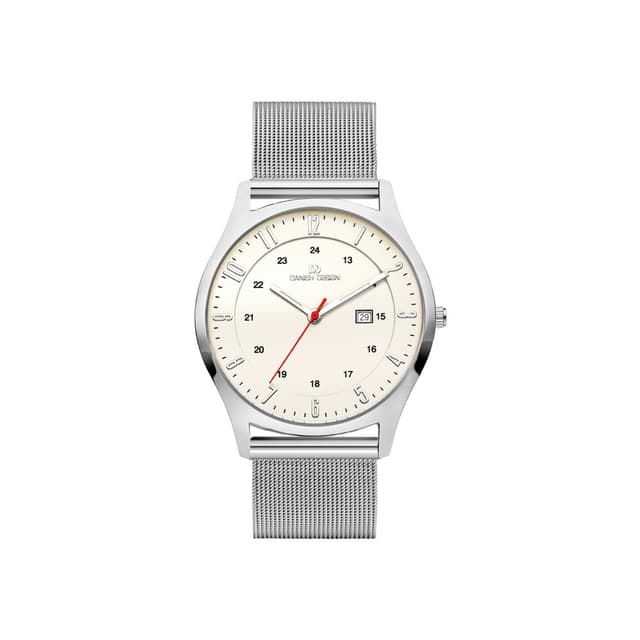 Dette ur fra danish design er den perfekte følgesvend til både hverdag og fest. Uret har en kasse i titanium med creme farvet skive, datodisplay, safir krystal glas og et mesh armbånd i rustfrit stål.