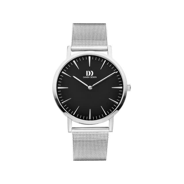 Dette simple og stilfulde danish design ur har en kasse i rustfrit stål med sort skive med sølvfarvede visere og tidsmarkører, mineral krystal glas og et mesh armbånd i rustfrit stål.