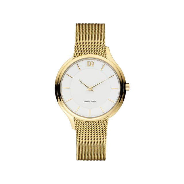 Ved at tage et ellers meget klassisk ur og gøre kassen skæv, har danish design skabt et helt nyt look. Uret har en guldfarvet kasse i ristfrit stål med hvid skive, mineral krystal glas og et armbånd i rustfrit stål.
