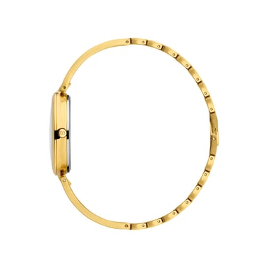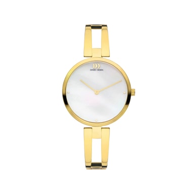 Nogen gange finder man de smukke detaljer i de manglende detaljer, hvilket danish design har formået at vise med dette simple ur. Uret har en guldfarvet kasse i rustfrit stål med hvid skive, mineral krystal glas og et armbånd i rustfrit stål.