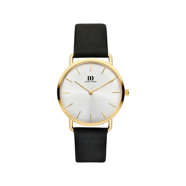 Perfekt til ethvert outfit, dette simple ur fra danish design har en guldfarvet kasse i rustfrit stål med hvid skive, mineral krystal glas og en sort rem i læder.