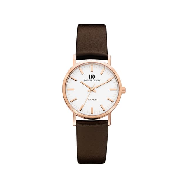 Med den rosaguldfarvede kasse i titanium og et klassisk udseende, kan dette ur fra danish design komplimentere ethvert outfit. Uret har også en hvid skive, mineral krystal glas og en brun rem i læder.