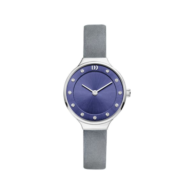 Med zirkoner som tidsmarkører får du et smukt ur med et feminint touch. Dette ur fra danish design har en guldfarvet kasse i rustfrit stål med blå skive, mineral krystal glas og en grå rem i læder.