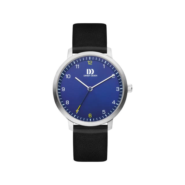 Simpelt men med præcis nok detaljer til at gøre det interessant. Dette ur fra danish design har en kasse i rustfrit stål med blå skive, mineral krystal glas og en sort rem i læder.
