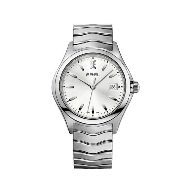 Ebel wave herre ur, 40.0 mm børstet og poleret rustfrit stål kasse, sølv galvanisk skive med påsat ebel symbol og markører og datodisplay, børstet og poleret rustfrit stål signatur wave-link armbånd med implementeringslås.