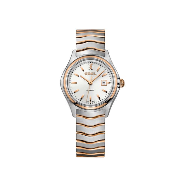 Ebel wave dame automatisk ur med 38-timers strømreserve, 30.0 mm rustfrit stål kasse med 18k rosaguld krans og krone, sølv galvanisk skive med påsat ebel symbol og markører og datodisplay, børstet og poleret to-tone rustfrit stål signatur wave-link armbånd med implementeringslås.