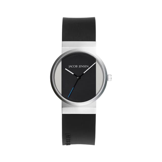 Designet af jacob jensen new series er blevet revideret tre gange siden udgivelsen i 1995, hvilket resulterede i nogle subtile, men betydelige ændringer i designet. Indersiden af uret har en lodret faldet rille, der udstråler sin tredimensionelle kvalitet. Det forstærker illusionen af remmen, der strømmer sømløst rundt om urets ansigt.