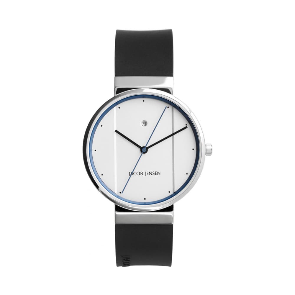 Designet af jacob jensen new series er blevet revideret tre gange siden udgivelsen i 1995, hvilket resulterede i nogle subtile, men betydelige ændringer i designet. Indersiden af uret har en lodret faldet rille, der udstråler sin tredimensionelle kvalitet. Det forstærker illusionen af remmen, der strømmer sømløst rundt om urets ansigt.