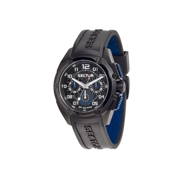 Kasse størrelse: 43x53mm, sector experience: sport, kasse materiale & finish: rustfrit stål, silikone, kasse tykkelse: 13,1, skive farve: sort, kasse finish: poleret, glas: mineral krystal, rem materiale: silikone, rem farve: sort og blå, spænde type: buckle, urværk: kvarts, vandtæthed: 5 atm, garanti: sector 2 års garanti, emballage: sector original emballage