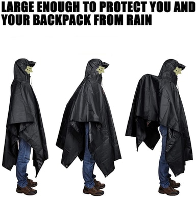 Multifunktionelt design: Denne poncho er ikke kun til beskyttelse mod regn, den kan også bruges fladt på jorden som en campingpresenning. Tyllerne på hvert hjørne kan bruges til at sætte det op som et nødly eller dække godset såsom rygsække eller andet campingudstyr.