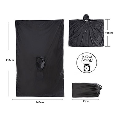 Multifunktionelt design: Denne poncho er ikke kun til beskyttelse mod regn, den kan også bruges fladt på jorden som en campingpresenning. Tyllerne på hvert hjørne kan bruges til at sætte det op som et nødly eller dække godset såsom rygsække eller andet campingudstyr.