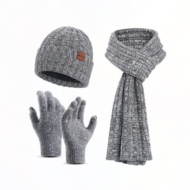 Størrelse: Hue: 22,5x25 cm, handsker: 23x9,5 cm, tørklæde: 197x29 cm