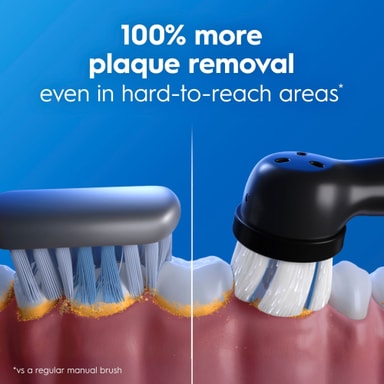 Den elektriske tandbørste kommer med et rundt børstehoved, der når områder, hvor rektangulære børster ikke kan rengøres dybere.