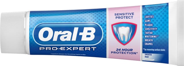 Oral-B Pro-Expert Sensitive Protect tandpastaen 951664 tilbyder en unik kombination af ingredienser, som beskytter dine tænder mod plak, huller og sensitivitet. 75 ml tandpastaen tilbyder 24 timers beskyttelse og mintsmag for frisk ånde.