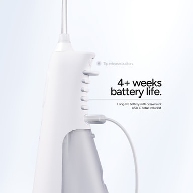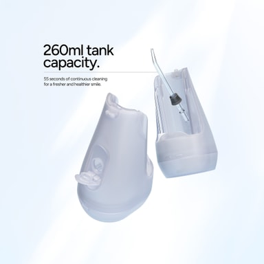 Tandrenseren har en 260 ml vandtank og et buet, riflet design med en slank dyse for præcis rengøring. Praktisk placerede trykindstillinger og tænd/sluk-knapper på forsiden sikrer nem betjening.