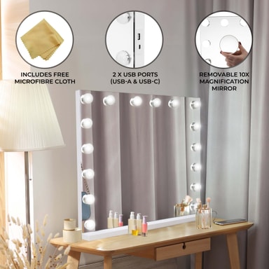 Forbliv forbundet og opladet med bekvemmelighed. Spejlet har to USB-porte - USB-A og USB-C - så du kan oplade flere enheder samtidigt. Uanset om det er din smartphone, tablet eller andet tilbehør, kan du holde dem tændt for problemfri brug gennem hele din skønhedsrutine.
