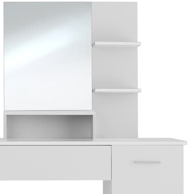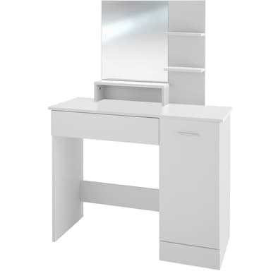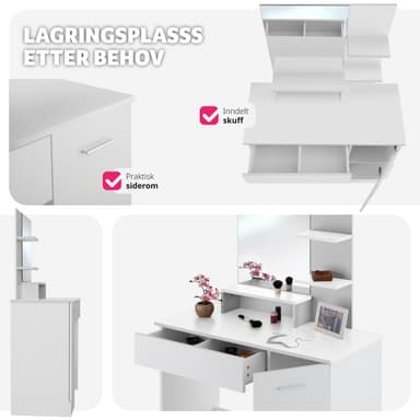 Den rummelige bordplade giver plads til dine makeup-produkter, hårbørster og stylingværktøjer, og de praktiske skuffer giver ekstra opbevaringsplads, så du kan holde orden og hurtigt finde det, du har brug for.