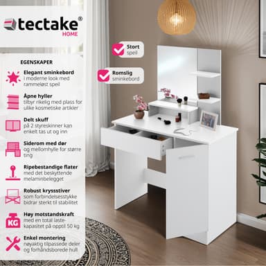Med sminkebordet Zoe fra Tectake bliver dit daglige skønhedsritual både stilfuldt og praktisk. Dette elegante bord kombinerer funktionalitet og æstetik, så du kan nyde en luksuriøs atmosfære, mens du lægger makeup eller ordner håret foran det store, klare spejl. Bordet er udstyret med en solid spånpladekonstruktion, som er belagt med en holdbar, ridsefast overflade, der gør det nemt at holde rent og pænt i mange år fremover.