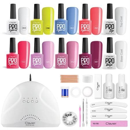 Komplet begynder Gellak Start sæt fra CLAVIER - Perfekt begynder startsæt hvor du får alt, der behøves for at komme i gang med Hybrid negle. Sættet er komplet med en effektiv Q7 UV LED negletørrer med effekt op til 48W.Læs mere om produktet