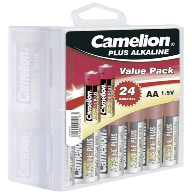 24 Alkaline AA-batterier i en praktisk kasse. Med kassen er der altid styr på batterierne, så du ikke behøver lede efter dem.