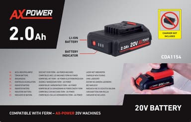 FERM CDA1154 er et 20V 2.0Ah Li-Ion batteri fra det populære AX-Power platform, kendt fra ACTION. Batteriet passer til alle FERM AX-Power 20V maskiner, fra boremaskiner til græstrimmere, og er også kompatibelt med FX-Power værktøj.