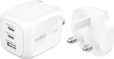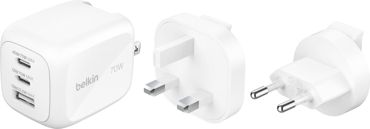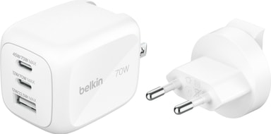 Belkin 70W Tri-port vægopladeren giver hurtig opladning til forskellige enheder, med global UK/EU/US stikkompatibilitet, pålidelig drift og flere sikkerhedsfunktioner, der sikrer sikker og hurtig strøm på dine rejser.Læs mere om produktet