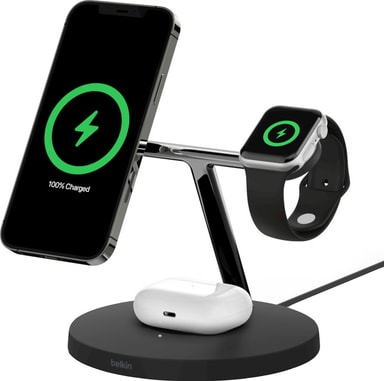 Den trådløse Belkin Boost Charge Pro 3-i-1 oplader med MagSafe er en MagSafe trådløs oplader til iPhone 12-modeller, en trådløs måtte til AirPods og et magnetisk opladermodul til Apple Watch. Den er praktisk til at oplade dine Apple-enheder samtidigt. Opladermåtten med MagSafe kan oplade iPhone 12 modeller med officielle MagSafe etuier med op til 15 W i portræt- eller landskabstilstand. Opladeren har en LED-indikator. Hvidt lys angiver at dine AirPods ligger korrekt og oplader, ravfarvet lys angiver at de ikke ligger korrekt eller at en ting ligger i vejen.