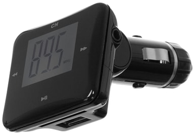 Universelt brugbar Kitsound FM transmitter til bil med 3,5 mm og USB stik. Bilstik bruges som strømforsyning.
