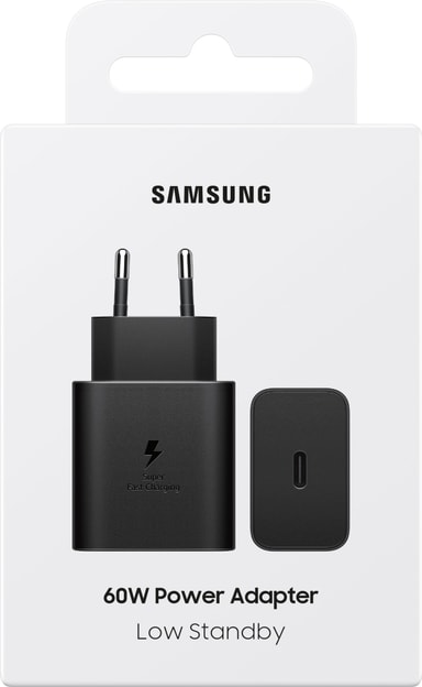 Samsung 60W strømadapteren leverer hurtig og sikker opladning til Galaxy-enheder med 60W effekt, USB-C-interface og et stilfuldt sort design, alt sammen i et kompakt format.