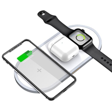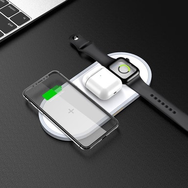 Trådlös laddplatta 3-in-1: Den här trådlösa Qi-laddaren kan ladda din mobil, Apple Watch och AirPods samtidigt. En snygg laddstation som hjälper dig att hålla ordning på skrivbordet eller köksbänken.