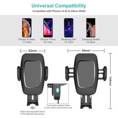 Arbejder med alle smartphones, der understøtter trådløs Qi-opladning. Hurtig opladning med 7,5 W til iPhone og 10W til Samsung Galaxy-mobiler. Fungerer med alle USB-opladere på 2A eller mere (USB-C-kabel medfølger). For funktionen som 7,5 W og 10 W hurtigoplader kræves en Quick Charge QC 2.0 / 3.0-kompatibel billader. Kan også bruges til GPS, holderen passer til en bredde mellem 62 og 94 mm.
