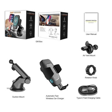 Pakken indeholder: Trådløs billader (Qi), sugekontakt, beslag til ventilationsgitter, ladekabel (USB-C hurtig opladning), manuel