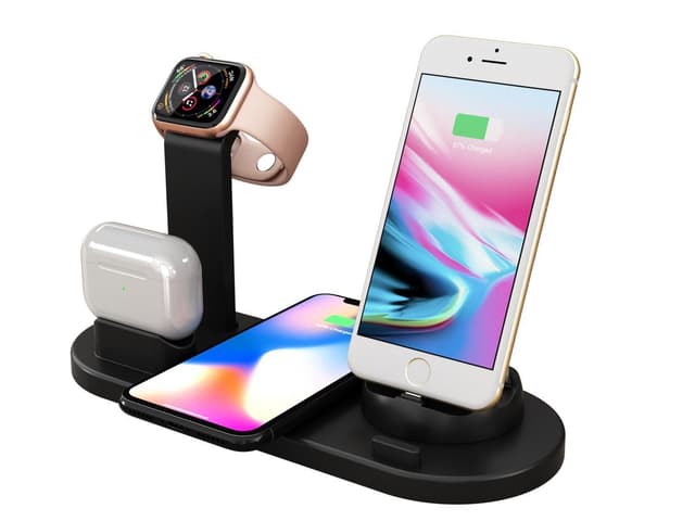 4-i-1 trådløs oplader med forskellige stikkontakter til forskellige enheder: Det multifunktionelle opladepunkt med iPhone / MicroUSB / USB-C-interface kan oplade de fleste mobile enheder, såsom iPhone, iPad, Samsung, LG, HTC, Huawei eller Sony. Opladningsstationen med de forskellige kontakter kan drejes frit 360 grader. Du kan også bruge opladeren som en trådløs opladningstablet og som oplader til Airpods og Apple Watch.