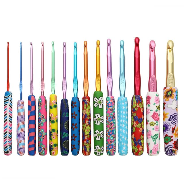 Hæklenåle med grebsvenlige længere håndtag for at give ekstra plads, når mønsteret kræver flere løkker. Hver hæklenål har sit eget unikke mønster, så du nemt kan holde styr på, hvilken du skal bruge.