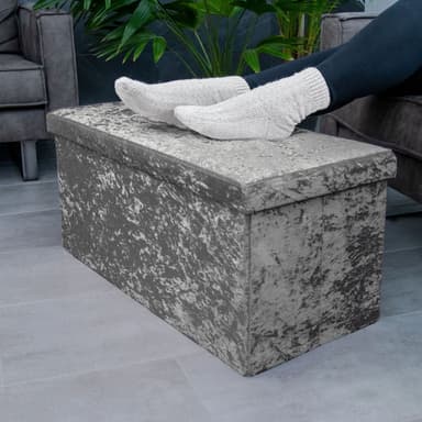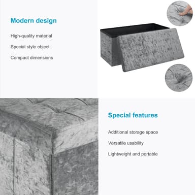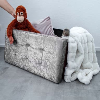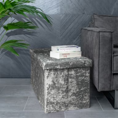DESIGN: Det elegante fløjlsbetræk på ydersiden og det bløde stof på indersiden af denne praktiske foldekasse/skammel får den til at se meget stilfuld ud og vil med garanti være et blikfang!