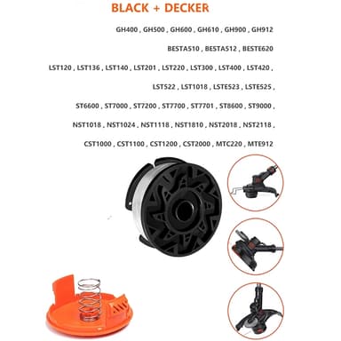 Bred kompatibilitet: Dette spolesæt er kompatibelt med en bred vifte af BLACK+DECKER trimmere, herunder modellerne GL280, GL301, GLC13, GLC2500, GLC3000, GLC3630L, GLC425, GL430, GL5430, GL54, GL5, GL54, GL 60, GL570, GL580, GL4525 ST201, LST220, LST300, LST400, LST420, LST522, LST1018, LSTE523, LSTE525, ST6600, ST7000, ST7200, ST7700, ST7701, ST8600, ST9000, NST1018, NST1024, NST1118, NST1810, NST2018 NST2118, CST1000, CST1100, CST1200, CST2000, MTC220 og MTE912.