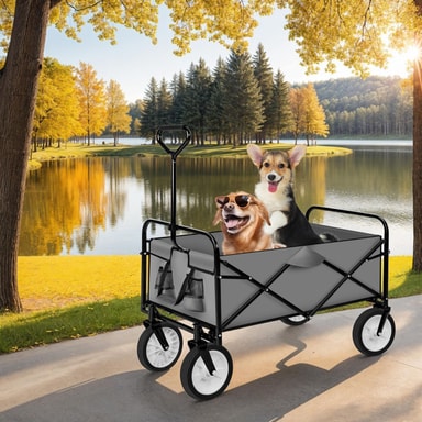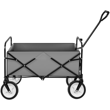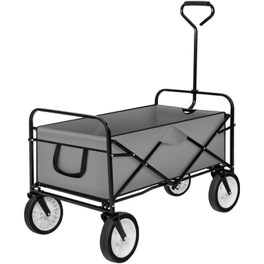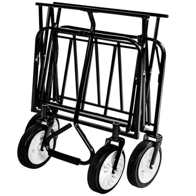 Den sammenklappelige trækvogn er meget alsidig, enten til transport af indkøb eller til familieudflugter eller som ekstra hjælper på byggepladsem. Den kan sammenfoldes med kun én hånd og passer derfor ind i kælder, garage eller bagagerum. Med sine 360 ° drejbare forhjul fremstillet lavet af plastik kan vognen let skubbes og trækkes. Takket være det robuste stålrørsstel har vognen op til 80 kg belastning.