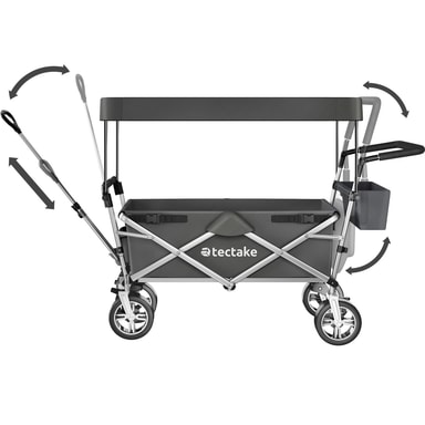 En af de største fordele ved vores trækvogn er den justerbare og polstrede skubbestang, der gør det nemt at navigere på ujævnt terræn uden at gå på kompromis med komforten. Den udtrækkelige trækstang sikrer, at du let kan trække vognen, mens dens lille venderadius gør det muligt at manøvrere selv i snævre rum. De to drejelige profilhjul foran giver fremragende kontrol, mens de to faste hjul bagtil sikrer stabilitet.