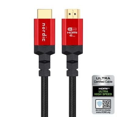 NÖRDIC Certified Cables 1m Ultra High Speed ??HDMI 2.1 8K 60Hz 4K 120Hz 48Gbps Dynamisk HDR Earc VRR Nylon Flettet Kabel Forgyldte KontakterLæs mere om produktet