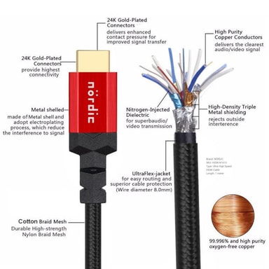 Dette NÖRDIC Ultra High Speed HDMI-kabel er certificeret i henhold til HDMI-organisationens Ultra High Speed HDMI Cable Certification Program, og det betyder, at kablet opfylder alle de tekniske specifikationer, der er defineret i programmet, inklusive opløsning op til 8K i 60Hz, 4K i 120Hz, båndbredde op til 48Gbps, understøttelse af 100Mbit/s Ethernet, Dynamic HDR, understøttelse af op til 32 separate lydkanaler ved hver 48KHz osv.
