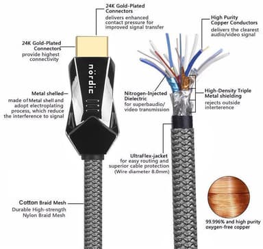 Dette NÖRDIC Ultra High Speed HDMI-kabel er certificeret i henhold til HDMI-organisationens Ultra High Speed HDMI Cable Certification Program, og det betyder, at kablet opfylder alle de tekniske specifikationer, der er defineret i programmet, inklusive opløsning op til 8K i 60Hz, 4K i 120Hz, båndbredde op til 48Gbps, understøttelse af 100Mbit/s Ethernet, Dynamic HDR, understøttelse af op til 32 separate lydkanaler på hver 48KHz osv.