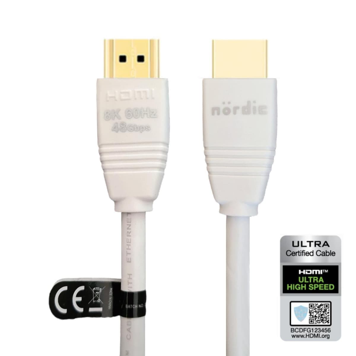 NÖRDIC CERTIFIED CABLES 1,5m Ultra High Speed ????HDMI2.1 8K 60Hz 4K 120Hz 144Hz 48Gbps Dynamic HDR eARC Game Mode VRR Dolby ATMOS guldbelagt PVC hvidLæs mere om produktet