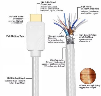 NÖRDIC Certified Cables 1m HDMI2.1 Ultra High Speed ​​8K 60Hz 4K 120Hz 48Gbps Dynamic HDR Earc Game Mode VRR Dolby atmos nylon Flettet kabel Forgyldt