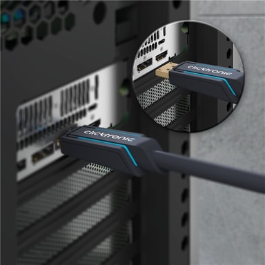 Clicktronic lægger stor vægt på holdbarhed og stabilitet. Vores kvalitetsløfte: 10 års garanti på vores DisplayPort™-kabler. Den proprietære konstruktion af vores forbindelseskabler gør dem ekstremt robuste. Den tredelte stikkonstruktion af PVC- og ABS-komponenter kompenserer for ryk i kablet, hvilket gør det ideelt beskyttet mod kabelbrud. Guldbelagte kontakter af høj kvalitet og rene kobberledere overfører lyd- og videosignaler i maksimal kvalitet for en perfekt hjemmebiograf- og spiloplevelse. Clicktronic DisplayPort™-kablet giver et knivskarpt billede og har en meget hurtig transmissionshastighed.