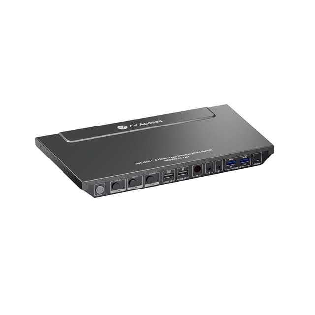 AV Access USB-C KVM-switch 3 til 2 med HDMI giver dig mulighed for at forbinde tre computere, der deler 2x HDMI 2.0, 3x USB 3.0, 1x USB 2.0, 1x USB 1.1, 1x RJ45 Lan og 2x 3,5 mm AUX. computer 1 er tilsluttet via USB-C og computer 2-3 er forbundet med to HDMI-kabler og et USB-kabel. Switchen understøtter HDCP 2.2, opløsninger op til 4k60hz og det er muligt både at spejle og udvide computerens skrivebord (Den kan kun udvides til en ekstern skærm via USB-C med MacOS). Switchen understøtter også EDID-emulering.