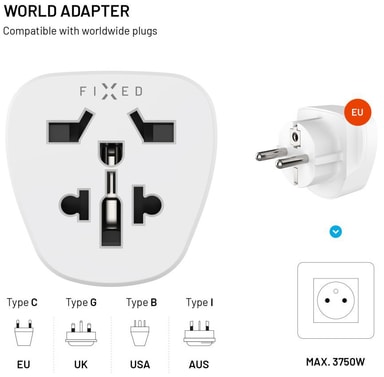 FIXED EU-adapteren er rejsendes bedste ven og tilbyder problemfri kompatibilitet med stik fra Storbritannien, USA, Australien og Asien. Det betyder, at du kan tilslutte og tænde for dine enheder fra næsten alle hjørner af verden uden behov for flere adaptere.