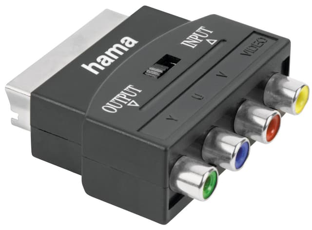 Hama Scart til YUV+V adapter til overførsel af analoge YUV-signaler og analogt videosignal. Universal tilslutning via IN/OUT-omskifter.