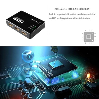 En mini 3-ports HDMI switch som gör det enkelt att växla mellan olika HDMI-källor. Den inbygda intelligenta switchern känner av vilken enhet som var aktiv senast, eller så byter du med knappen på själva enheten.